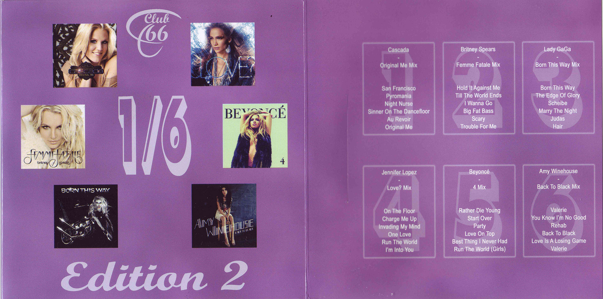 Kurzbeschreibung: Sixty-Six Records präsentiert Club 66 1/6 (Ein Sechstel) Edition 2 mit 6 Megamixen von Cascada, Britney Spears, Lady Gaga, Jennifer Lopez, Beyoncé & Amy Winehouse.